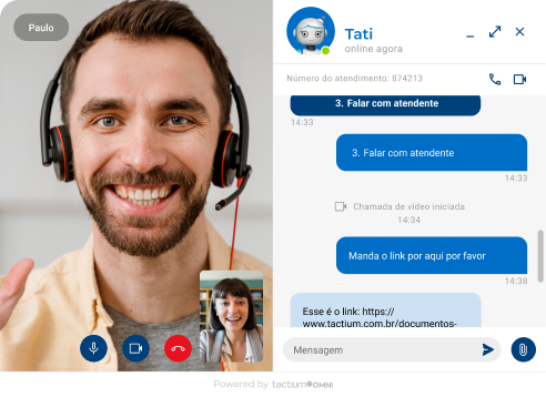 Solução de chat proprietário para websites que integra atendimento automatizado e humano em uma interface personalizada. Permite escalar a interação de mensagens de texto para voz e vídeo (WebRTC) diretamente no navegador, sem necessidade de instalações adicionais.